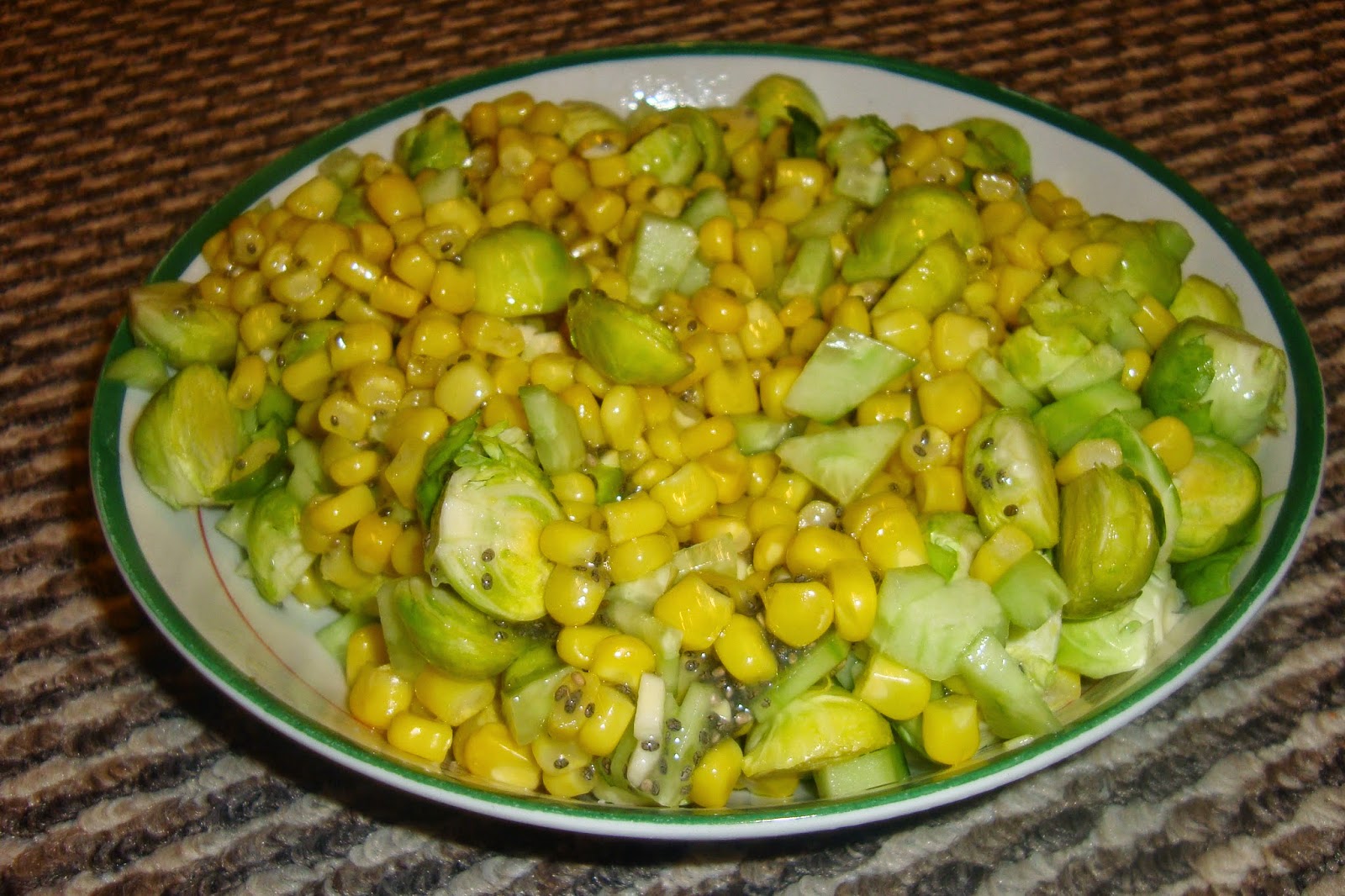 НЕОБХОДИМИ ПРОДУКТИ ЗА САЛАТАТА : 400 гр. замразена царевица, 1/2 краставица, нарязана във форма по желание, брюкселско зеле - 15 - 20 зелчета, 1 ч.л. предварително накиснати във вода семена от чия, зехтин , щипка хималайска сол по желание, 2 - 3 склидки ситно нарязан чесън.