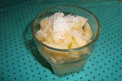 Когато всичко е готово нарежете на ситно почистеният пъпеш, поставете от пъпеша във всяка чаша, отгоре поръсете отново кокосови стърготини.