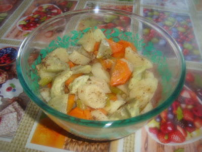 Всички кореноплодни зеленчуци / моркови, пащърнак, корен магданоз, целина / хубаво измийте и почистете с четка.При нужда обелете кората и нарежете на парчета.Артишокът почистете като използвате кухненски ръкавици от твърдите външни листа.Достигайки вътрешността ще забележите по - меки и крехки листа, които напомнят на цвета на магарешкия бодил.Те също се почистват щателно и се отрязва мъхестата част с нож.Трябва да останат само дъната / твърдата част на артишоците /, които се поставят или във вода и лимонов сок или само в лимонов сок.Иначе много бързо ще потъмнеят.