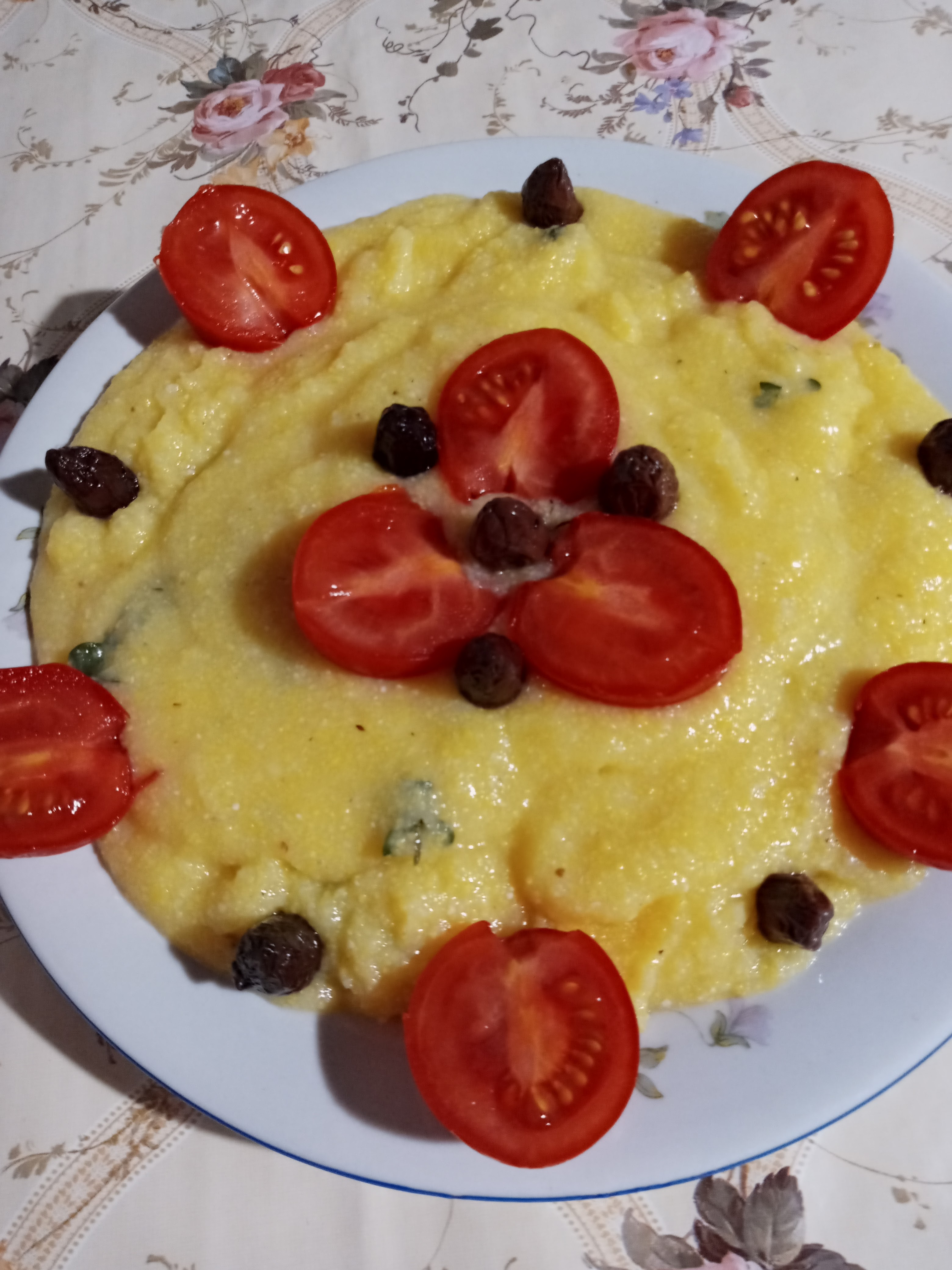 КАЧАМАК С БАЛКАНСКА ЧУБРИЦА, ЧЕРИ ДОМАТИ И МАСЛИНИ СТАФИДАКИ